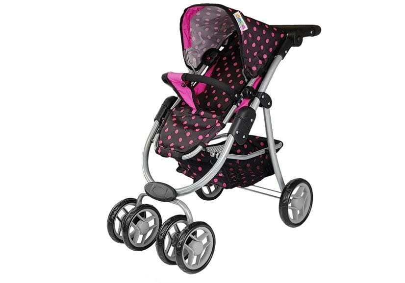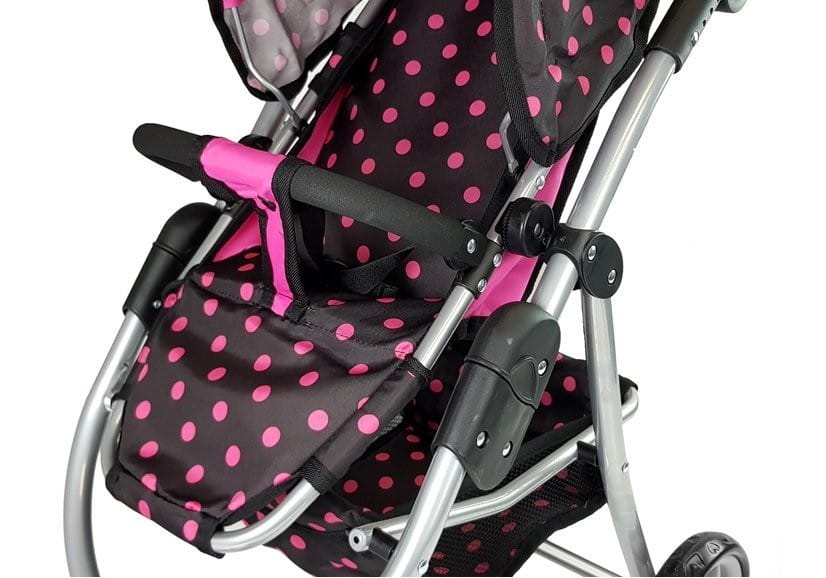 Wózek z torbą jest w czarny w ciemnoróżowe kropki, daje dużo uroku. Wzornictwo przypomina prawdziwy odpowiednik, co dodaje realizmu. Konstrukcja wykonana jest z solidnych i wytrzymałych rurek aluminiowych o srebrnym kolorze, które połączone są czarnymi, plastikowymi łącznikami. Użycie do produkcji wózka wysokogatunkowego tworzywa odpowiada za komfort i wygodę płynące z użytkowania zabawki, co w połączeniu z ulokowaniem wózka na czterech wąskich kołach podnosi łatwość prowadzenia wózka i manewrowania nim.
